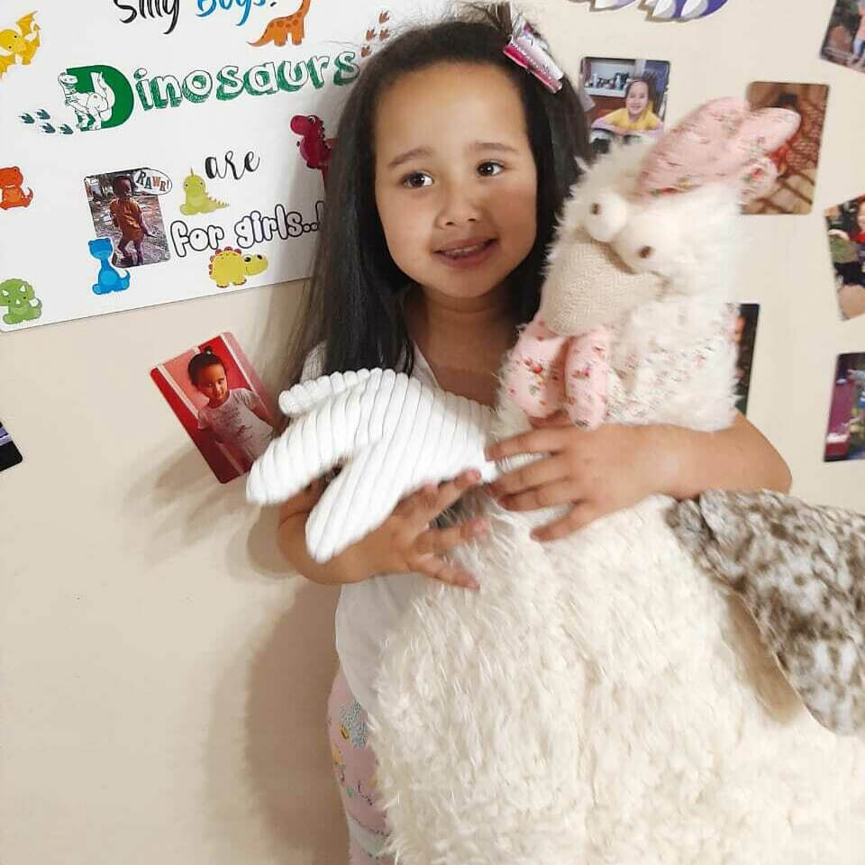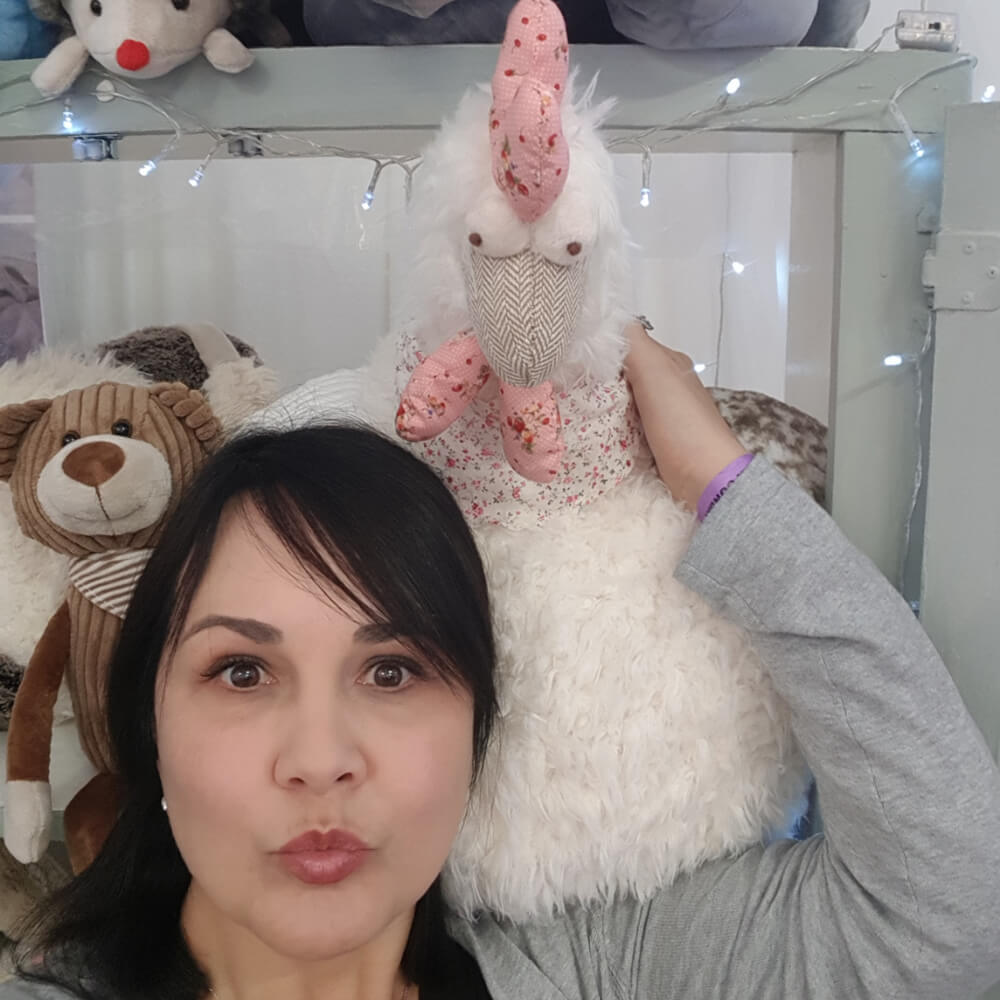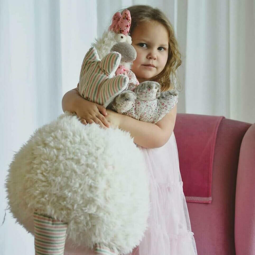 Henriette is designed with long soft plush fabric all over her body, with velvety smooth plush and corduroy for sensory touch on her wings. With floral cotton on her tail, scarf, and small detail she is a sophisticated chicken. Ready to be part of a loving Forever-home.